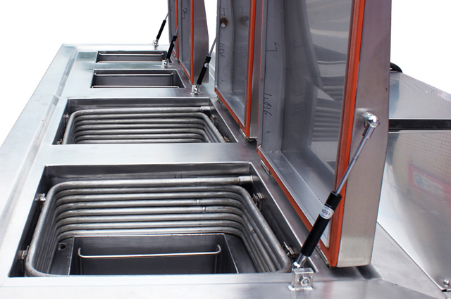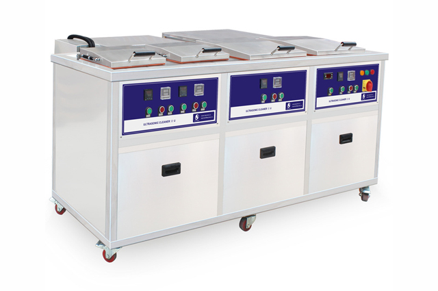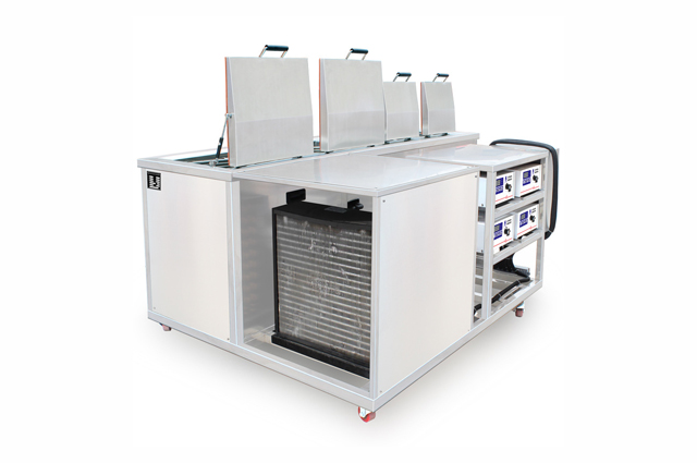 四槽冷凝防爆超聲波清洗機可使用如三氯乙烯、三氯乙烷等或其他性質(zhì)相似的清洗劑等作為清洗介質(zhì)。